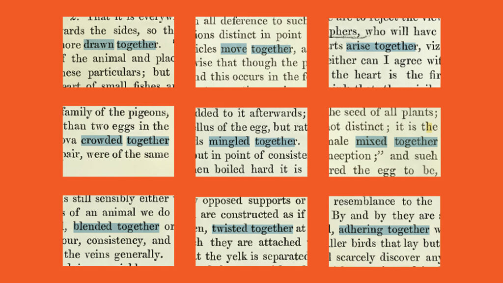 During his research, Titchner was inspired by the work of William Harvey (1578–1657), an alumnus of the University of Cambridge and the first physician to describe systemic circulation. Searching Harvey’s writings, Titchner collected instances of the word “together” including phrases such as “drawn together,” “mingled together,” “arise together,” “combine together,” and “unite together.” These became the foundation of a text-based artwork exploring collective action, shared experience, and connection.